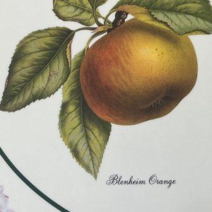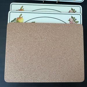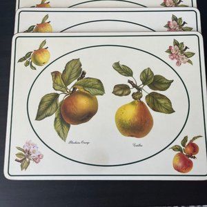 These high-quality cork-backed placemats were made in England by Royal Table, and come in a box of 4. The pattern is called Fruit Classics, and features Blenheim orange apples and Catillac pears. They measure 12" by 9". Three placemats look unused, one has some light scratching/scuffing to the top (only visible in some light from the side).