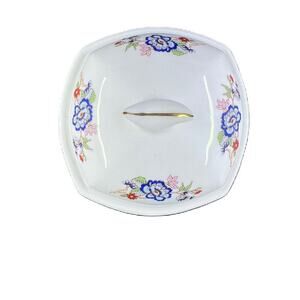 Design features florals in blues, reds and pinks with green leaves.