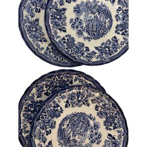 This set of four 8-inch plates features intricate blue and white floral designs with a classic countryside illustration. Made in England from durable earthenware, these plates are microwave and dishwasher safe, combining elegance with functionality for any table setting.