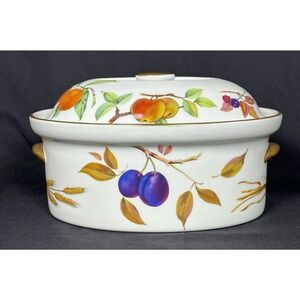 Elegant and Timeless! This Vintage Royal Worcester Evesham Gold Casserole dish is perfect for adding a classic touch to your kitchen and your dining table. The casserole dish is porcelain bone china and has capacity of 2.5 QT. The casserole is oval and the color is cream with multicolor fruit designs and gold accents. This casserole dish comes with a lid and is perfect for preparing and serving your favorite casseroles. Make this part of your upscale dining serve ware today! 2059