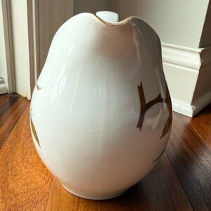 Off white pitcher with orange / pink peaches and branches on one side and purple plums and branches on the other with gold trim