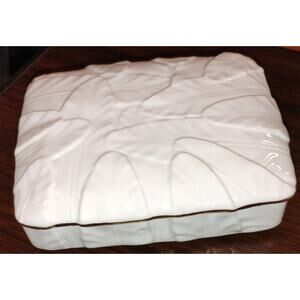 Elegant and timeless Royal Worcester “Fern Leaf” trinket box crafted in fine bone china. This rectangular lidded box features a raised fern leaf relief design in glossy white glaze, accented with a thin gold trim around the edges. Made in England and dated 1986, this piece reflects Royal Worcester’s exquisite craftsmanship and classic English design.