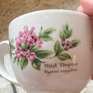 Beautiful set of 13 perfect condition Royal Worcester cups. No chips or cracks, green rimmed, handle cups. One side features Fever Few and the other side is Wild Thyme. Lovely butterfly image on inside. Would look great as part of a breakfast or brunch table setting!