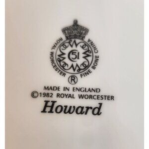This Royal Worcester Howard dinner plate, crafted from fine bone china, exemplifies timeless elegance with its navy blue and gold trim detail. Manufactured in England and dated 1982, this vintage collectible is a distinguished addition to any dining collection. With a diameter of 10.5 inches, it provides ample space for formal or casual dining settings. Its enduring design and high-quality craftsmanship ensure its place as a cherished tableware piece. The back stamp authenticates its Royal Worcester legacy, highlighting its Howard pattern and heritage.