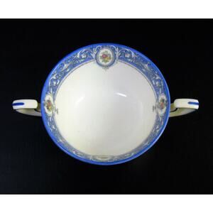• Fine Bone China Made In England by Royal Worcester. Features Pattern "Portia" Blue Scrolls, Fleur de Lis, And Fruit Cameo Design With Blue Trim On Foot And Double Handles!