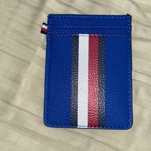NWOT. Excellent condition. Never been used. One small pen mark on the back of the bag. Please refer to pictures when looking at the condition. Navy blue and royal blue bag from Tommy Hilfiger. Gold hardware. Also comes with a little matching cardholder. Has 1 zippered pocket and one regular pocket inside the bag. Also has a pocket outside the bag. Crossbody strap that is adjustable. Comes from a pet friendly and smoke free home.