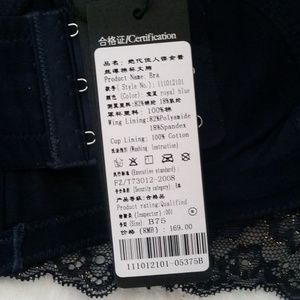 NWT Moonbase 'Victoria' royal blue lacy push-up bra size 32 B. Very nicely made. Cups are made with 100% cotton with removable padding. Wing lining is made of 18% spandex and 82% polyamide.