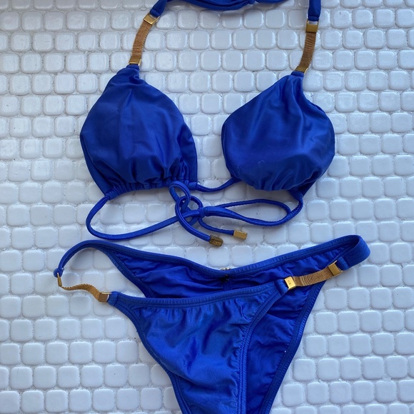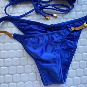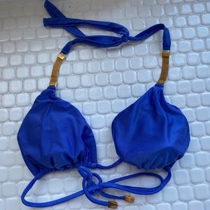 Worn maybe twice! Stunning royal blue color with gorgeous gold mesh along the straps. Some slight pulling from general wear and tear shown in the photos.