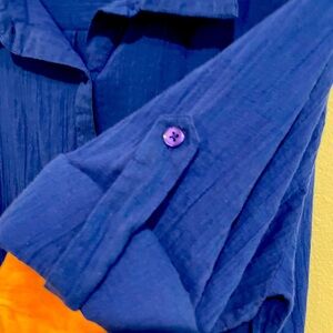 Royal blue light weight gauze oversized shirt shacket. Buttons all the way down. Rolled sleeves. Wear as long shirt, jacket or add a belt. Very versatile piece.