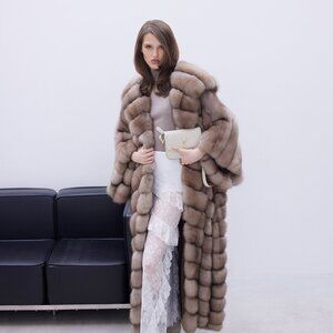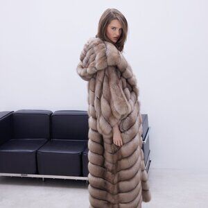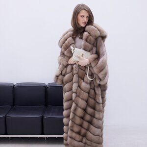 A royal sable coat in the rare Lavender shade, featuring a voluminous hood flowing into a luxurious collar. Length: 135 cm. An embodiment of timeless elegance and grandeur