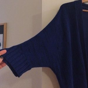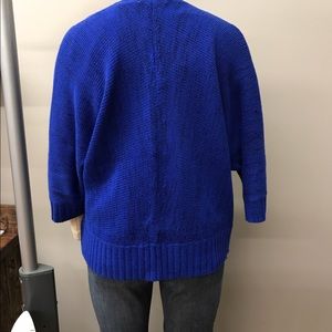 Royal blue Cotton/rayon kimono sweater with 3/4 sleeve length. 1 1/2" rib placket on the front and 3 1/2" 2 x2 rib bottom and sleeve cuffs. Length 26 1/2". Worn twice, in excellent condition.