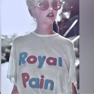 Comfy Wildfox "Royal Pain" Graphic Sweatshirt. This relaxed-fit sweatshirt from Wildfox features a soft, off-white or cream fabric with a slightly distressed look. The front is adorned with a playful graphic that reads "Royal Pain" in bold, contrasting blue and red lettering. It has a classic crew neck and long raglan sleeves, perfect for a cozy yet cheeky statement!