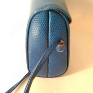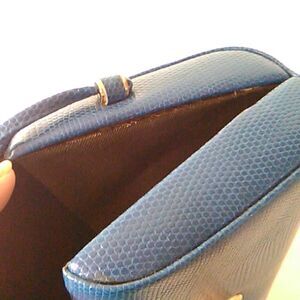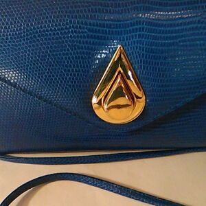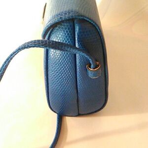 Vintage. Beautiful reptile finished bag. Rigid frame opens with a center hinge. A turning lock closes the front and a long attached strap makes this a shoulder bag. Black lining. Gold tone hardware. Excellent condition. Measures 5.5 high, 3 wide, 9.5 wide. 21.5 inch drop from strap. super cute!