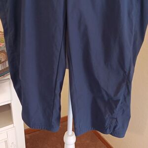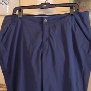 Navy pants by Royal Robbins. Quick dry fabric. Two front pockets, two zip back pockets. Mesh pocket liners. Size 16 measures 38 at waist, 11 inch rise, 50 inch hips, 22 inch inseam. Ankle length. Comfortable and versatile.
