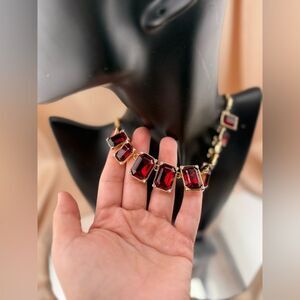 Make a regal statement with the Royal Ruby Radiance Necklace. This breathtaking piece features a series of bold, emerald-cut red stones that shimmer with every movement, exuding luxury and timeless elegance. Set in a classic gold-tone frame, each stone captures the essence of sophistication and power, reminiscent of royal jewels.