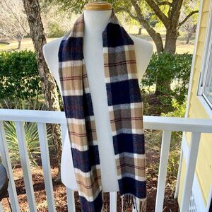 Excellent condition Royal Spayside 100% Lambswool Scarf. Made in Scotland. Tan/blue. No stains or damage. From smoke free pet free home. See pics of actual item. Length 68”, width 10”.