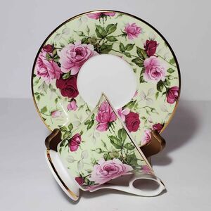 Chintz Collection by Royale Garden Staffordshire teacup and saucer. Green background with pink roses. Bone china.