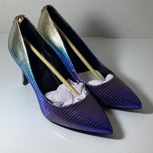 A pointy toe and tapered heel balance a lustrous pump that will complement your party-ready looks.