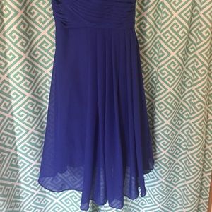 True blue strapless midi dress with boning in the front. Pleated detailing on the top. Zipper in the back. Sweetheart neckline. Custom ordered to fit 32B bust. Knee length.
