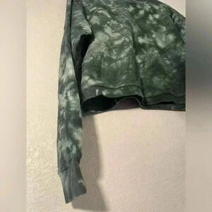 The sweater is a long-sleeve, tie-dyed design featuring a mix of dark blue and lighter blue/white shades. It has a crew neck and has a relaxed, slightly cropped fit. The fabric has a ribbed texture, adding to its casual, comfortable style.