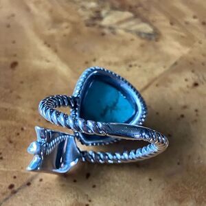 This gorgeous ring is made with genuine, earth mined Royston turquoise. The metal on this ring is solid .925 sterling silver, and it has an arrow design. This is a very unique, quality piece that should last for years. The ring in the photos is the one you will receive, so please see photos for gemstone quality and measurements. The ring is currently set at a size 6, but it is very easily resized. I can adjust the size upon request.