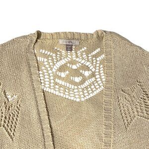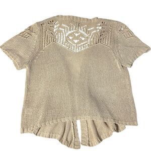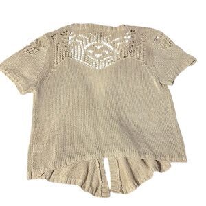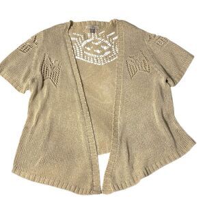 Roz & Ali 1X cropped open cardigan in neutral oatmeal color short sleeve.