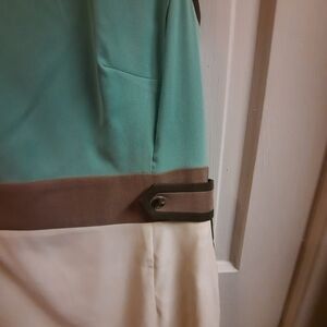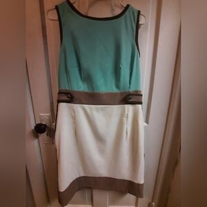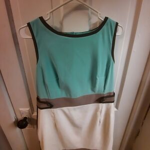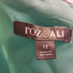 Stylish asymmetrical dress by Roz & Ali. Features a teal top with a white skirt. Accented with gray trim.