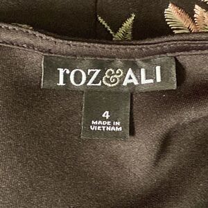 Elevate your wardrobe with this timeless Roz & Ali sleeveless dress, size 4. Crafted from a thick stretch fabric (96% polyester, 4% spandex), it features delicate floral embroidery throughout and a scalloped crochet lace hem for added charm. The flattering fit-and-flare silhouette makes it perfect for a variety of occasions, from daytime events to evening gatherings.