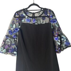 Roz & Ali Black Floral Shift Dress Sz 4 Sheer Embroider Women Elegant Bell 3/4