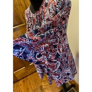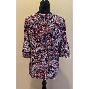 Roz & Ali Blouse Size Large Navy Red Paisley + Stretch Bell Sleeves Casual Top