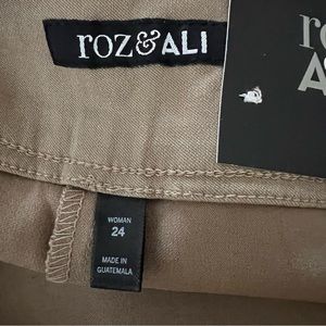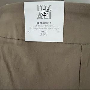 Roz & Ali Classic Fit Ankle Pants. Sits high on the waist, fits comfortable thru hip & thigh. 75% rayon, 22% nylon, 3% spandex. Machine wash. Studded detail on split hem. Appx. measurements with garment laying flat: