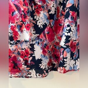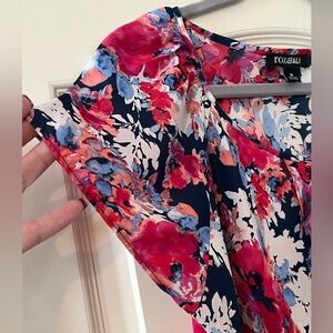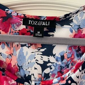 EUC excellent condition! Vibrant fuchsia, blues and white polyester blouse by Roz & Ali. Beautiful colors. Short sleeves. Longer length, tunic style. Can wear with leggings or dress pants. Measurements in photos. Women’s size medium. Smoke free home.