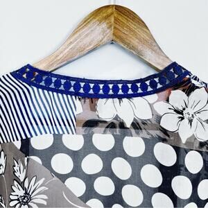 FEATURES: sheer patchwork kimono, mixed floral and geometric prints in yellow orange navy and white, open stitch lattice detail around neckline and seams, oversized glowing fit, half sleeves