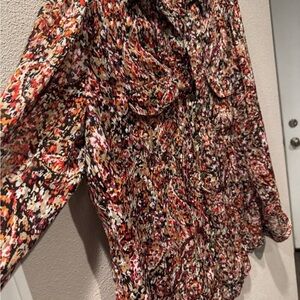 This stylish Roz & Ali button-up blouse features a beautiful floral print, semi-sheer fabric, and roll-tab long sleeves for a versatile look. Designed with functional front pockets and a lightweight, flowy fit, this top is perfect for layering or wearing on its own.