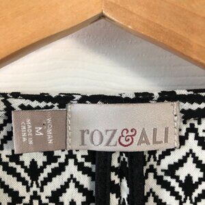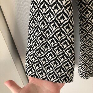 This career jacket is by Roz & Ali. It is black and white with a geometric print. It has an open front and 3/4 length sleeves. It is lightweight and a perfect layering piece to wear to the work office. It is in excellent pre-owned condition with no holes, rips or stains. Bundle with other items from my closet to get the most out of shipping!