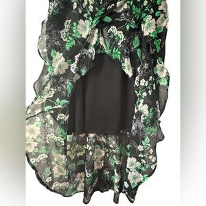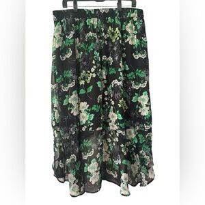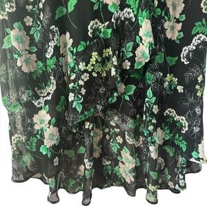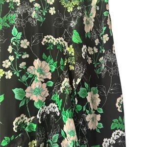 Elegant floral skirt featuring a blend of black background adorned with a floral pattern in shades of green, pink, and white. The skirt has a wrap-style design with a shorter navy lining underneath. Includes ruffles and an asymmetrical hemline. Roz & Ali is a fashion brand known for its versatile and contemporary skirts, designed to be mixed and matched for various occasions. The floral pattern and wrap design of the skirt align with current fashion trends, offering a stylish and feminine look. Preloved with more love to give. Waist 17-19 L 25-34