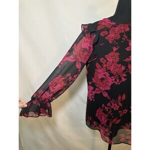 Roz & Ali Red Black Floral Whimsigoth Sheer Ruffles Long Sleeve Top Women SMALL