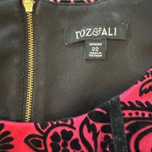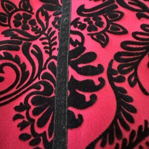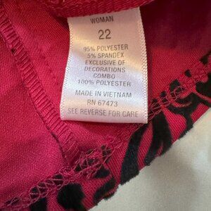Red and black Cocktail Dress with a gold zipper on the back. Size 22, sleeveless, boat neckline, fit in the bust and flares at the waste, paisley print, short, length is 41.5", 95% polyester, 5% spandex. Great condition and only worn once.