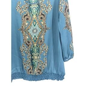 Roz & Ali Womens Boho 1X Teal Baroque Print Blouse 3/4 Sleeve Bubble Hem Top