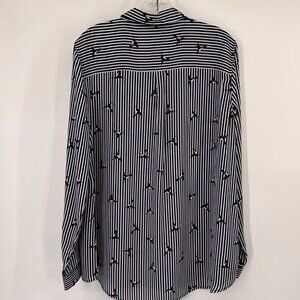 This Roz & Ali blouse features a striking striped pattern enhanced by a charming bird print. Its long sleeves and button-up design offer a classic look. The polyester fabric ensures durability and comfort, making it suitable for various settings.