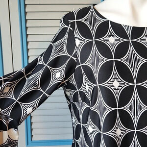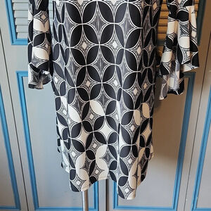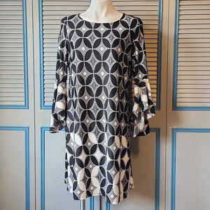 Keywords: Roz & Ali dress, flare sleeve dress, geometric print dress, size large women’s dress, black and white dress, polyester spandex blend, casual chic dress, trendy flare sleeves, good condition dress, women’s fashion.
