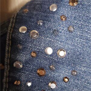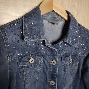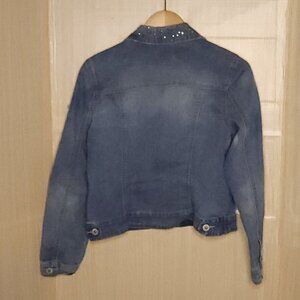Roz & Ali women’s studded denim jacket small. Gently used condition, there are some white spots on back of right arm (see photo), and a few studds missing (see photo). Measurements are: 23” sleeve, 20” from shoudler to hem, and 19” from armpit to armpit.