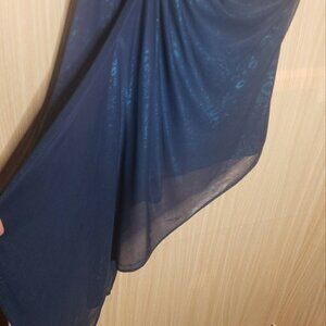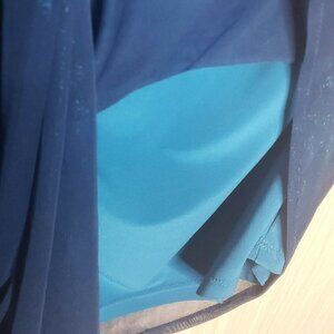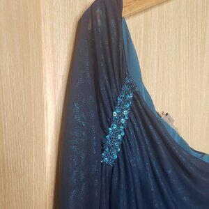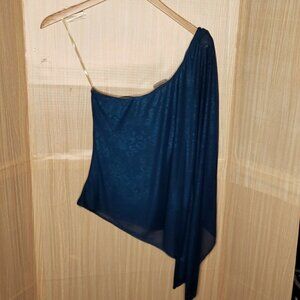 Roz & Ali women’s teal one shoulder flowy blouse large. Layered with sheer layer. Gently used condition. Measurements are: 27 ½" from shoulder to hem, and 15 ½" from armpit to armpit.