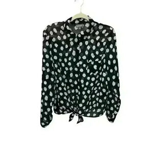 Roz & Ali Womens XL Blouse Black White Polka Dots Sheer Tie Bottom Lightweight