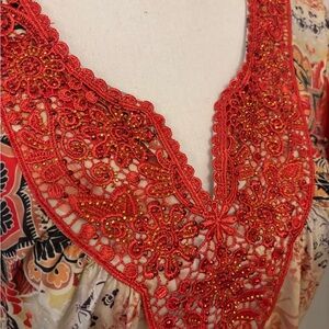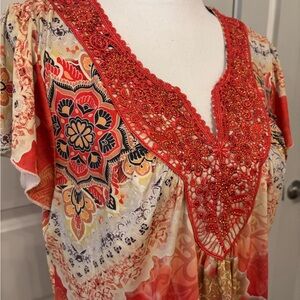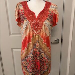 Roz & Ali bright orange beaded v-neck flowy blouse size L