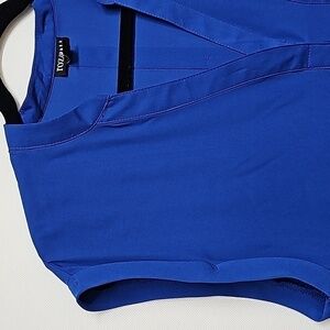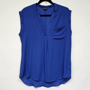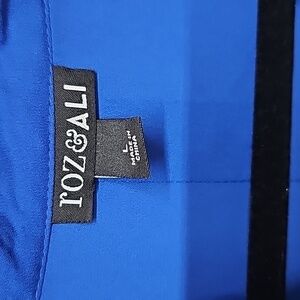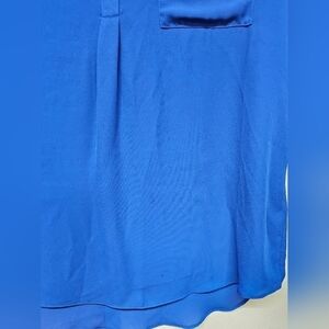 Roz & Ali cobalt sleeveless sheer blouse, faux (gold) button down back, cuffed shoulders, chest pocket, v-neck. Some light stains front right under pocket, otherwise good condition, smoke free.