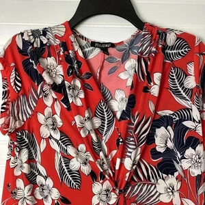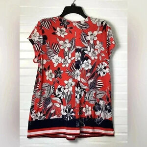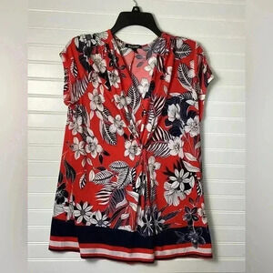 Roz & Ali, V-neck, cap sleeve, red/blk/wht, floral Size Large Blouse Top stretchy
