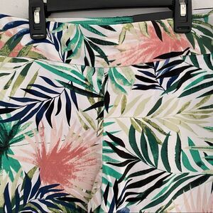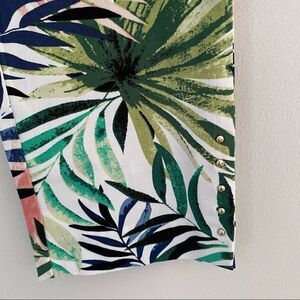Pull on colorful tropical print. Stretchy. Metal studs details on the hem and a small slit. Classic fit sits high on the waist. Fits comfortably thru hip & thigh.