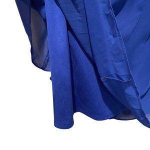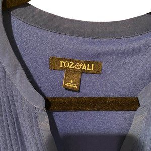 Roz and Ali size 8 blue sleeveless Vneck dress with buttons and sheer overlay. Preowned in great condition with no signs of wear, tear, or staining.