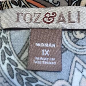 Roz and Ali plus size women’s top in gray, peach and white will look great with jeans, under a business suit or compliment slacks and capris. The sheer front over layer brings a spot of femininity to this top.